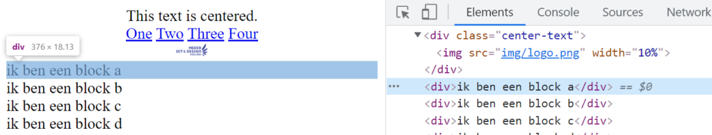 Zoals je ziet is de tekst zelf binnen de content van het <div> element niet gecentreerd. Om dit op te lossen dien je de CSS text-align:center toe te voegen zoals in het vorige onderdeel is beschreven.