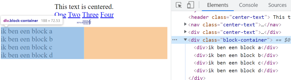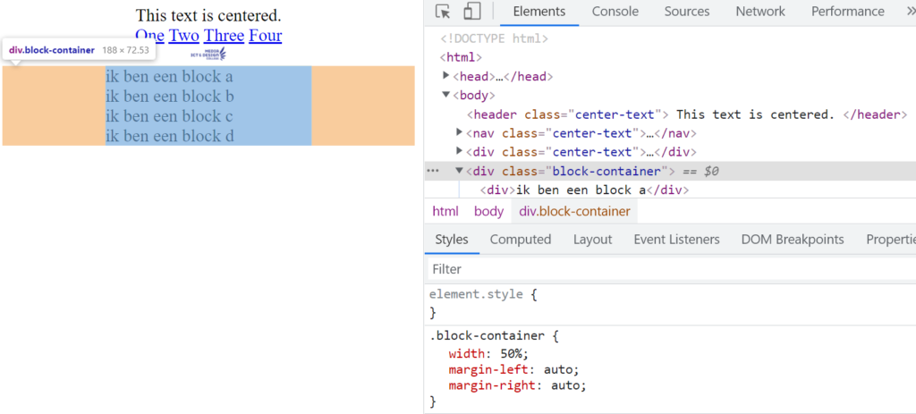 Kijk je naar dit voorbeeld dat zie je dat de content (het blauwe gebied) van de block elementen de helft van de mogelijke breedte is geworden. Het overige deel (het oranje gebied) betreft nu de marge. En zoals wellicht bekend kun je de marge van een element wijzigen met de margin eigenschap in CSS.